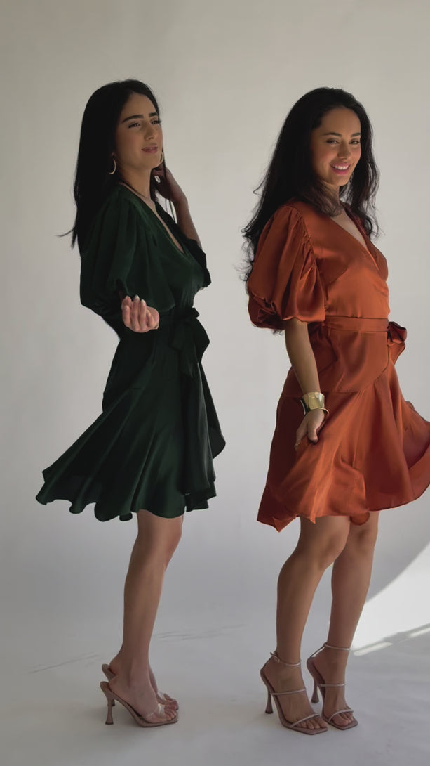 Our Chiamara Wrap Dress is a stylish flirty dress with pleated bubble sleeves and a tie waist; perfect for cocktails, weddings, and parties to dance the night away!